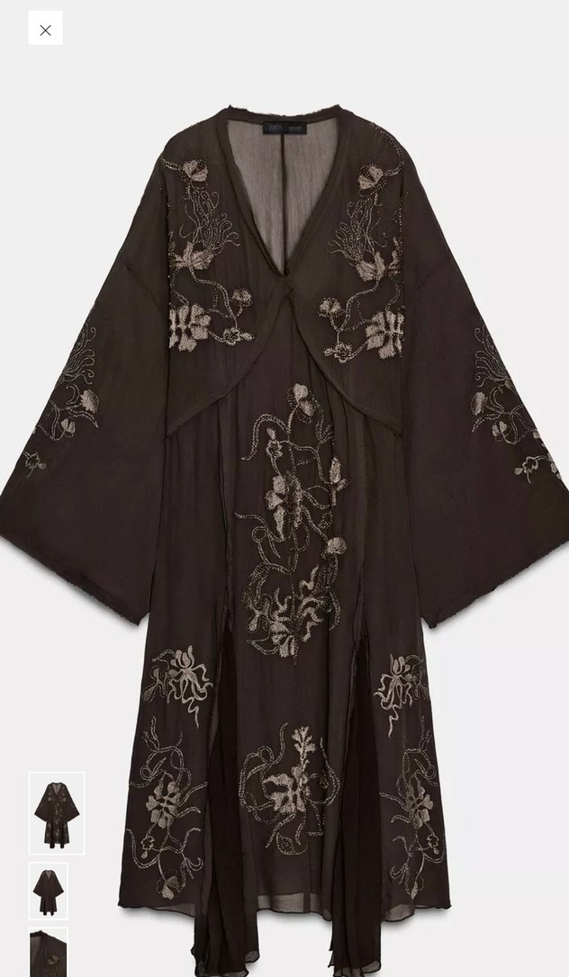 Uzun, bol kesim kahverengi ipeksi kumaştan yapılmış kadın kimono, detaylı nakışlı çiçek desenlerine sahiptir. Drapeli tasarım, V yaka ve uzun kolludur, günlük kullanım için uygundur.