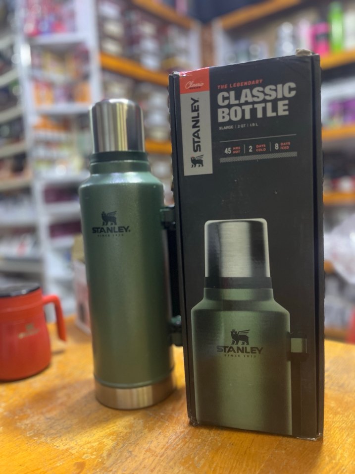 Stanley Classic Bottle parlak haki renkte, dayanıklı yapısıyla içecekleri uzun süre sıcak veya soğuk tutar..