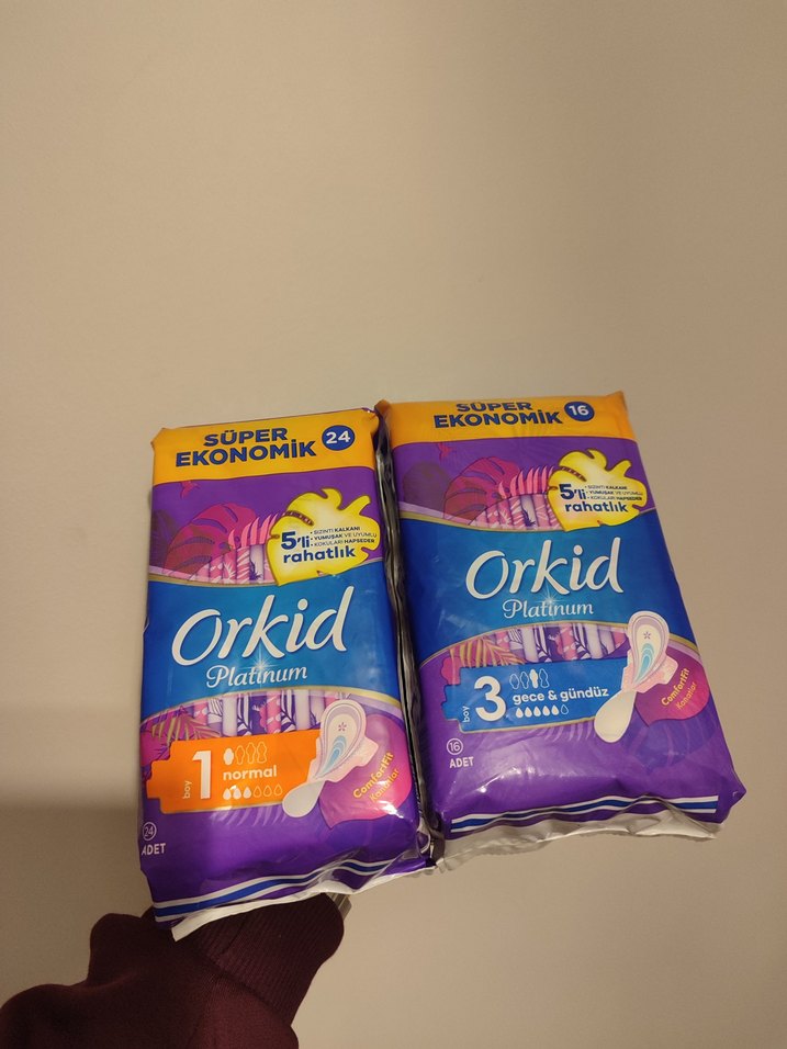 Orkid Platinum renkli hijyenik pedler, gündüz ve gece kullanımı için farklı boyutlarda rahatlık sağlar. Paketler 24 ve 16 adet içerir. ürünlerin son kullanma tarihi bu yıl Nisan ayıdır sıfır kapalı paketinde