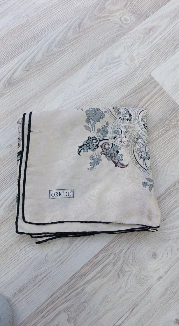 Kadınlar için beyaz ve gri renklerde, drapeli vintage tarzda tekstil fular. Üzerinde 'ORKIDE' etiketi ve klasik desenler bulunur.