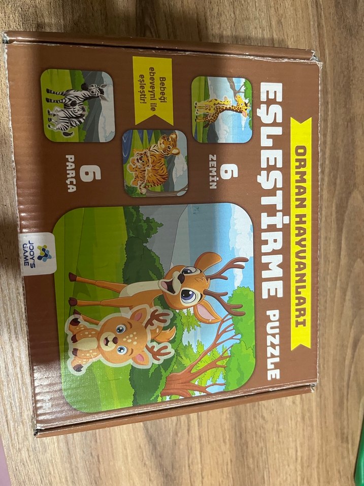 Koyu kahverengi kutuda 6 parçadan oluşan orman hayvanları eşleştirme puzzle. Çocukların eşleştirme ve hayvanları tanıma becerilerini geliştirir. Anne ve yavru büyük küçük kavramlarını öğrenmelerine yardımcı olur