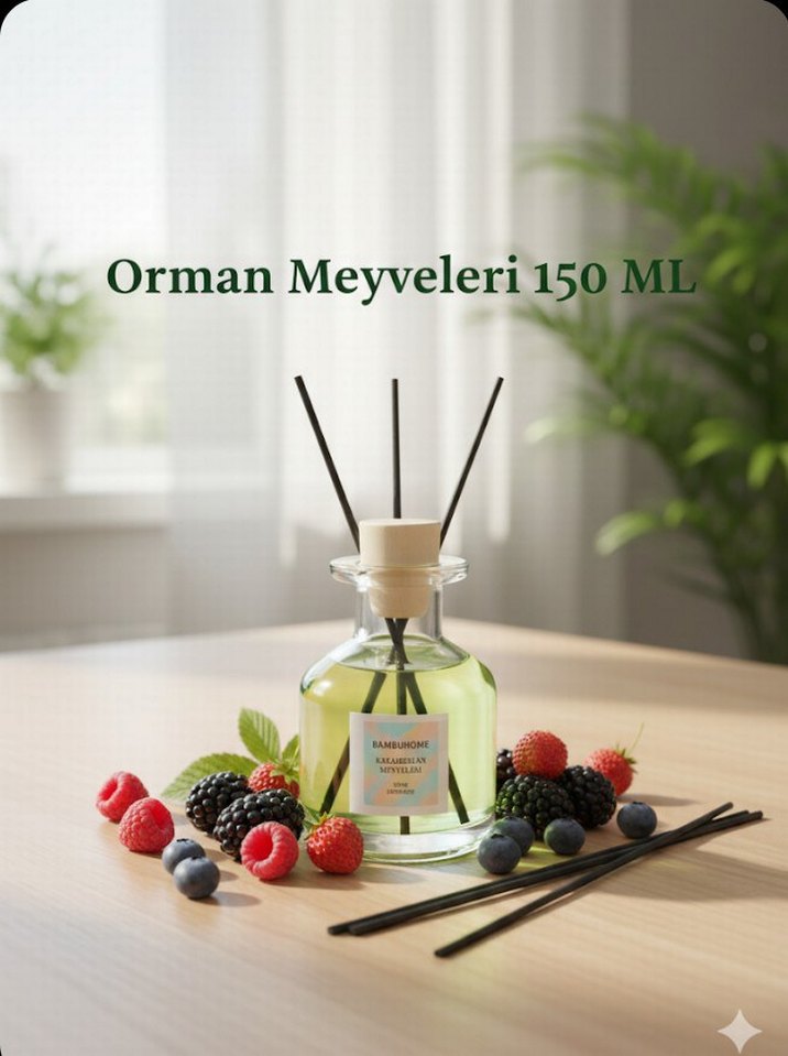 Orman meyvesi kokusuna sahip 150 ML kadın parfümü, cam şişede ve difüzör çubuklarıyla sunuluyor.