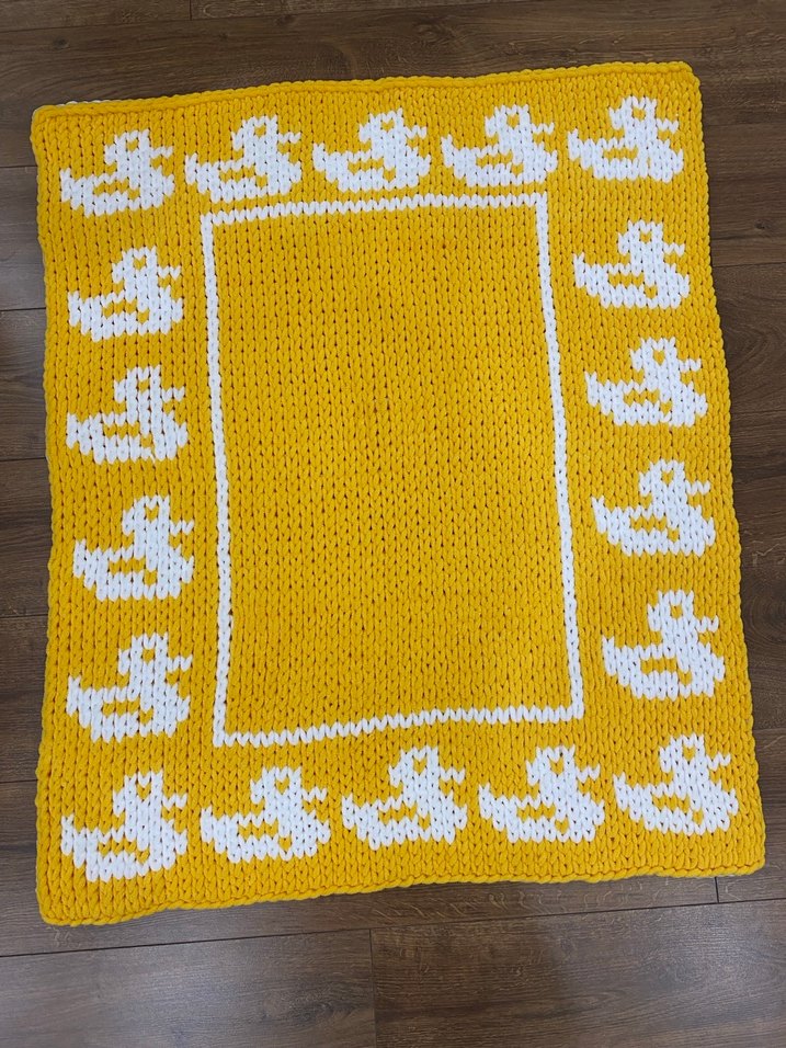 Sarı örme bebek battaniyesi, kenarlarında beyaz ördek desenleriyle yumuşak dokuludur. Herrenk ve model örülür