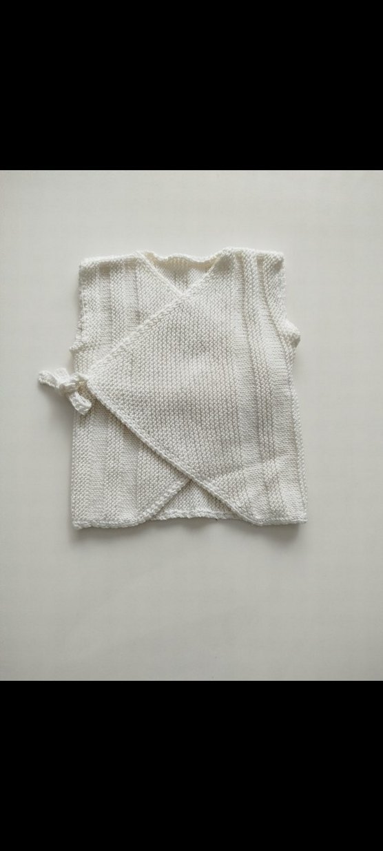 Beyaz renkli, yumuşak dokulu, bağlamalı ve sarmal tasarımlı bebek yeleği