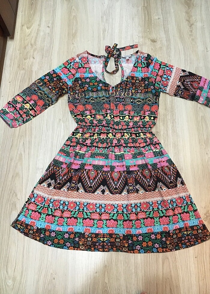 İnce örme elbise ,hiç giyilmedi,kağıt etiketi mevcut değil,açık yaka,etnik desenli,replika,bel ince lastikli ,L beden ama 38 de olur