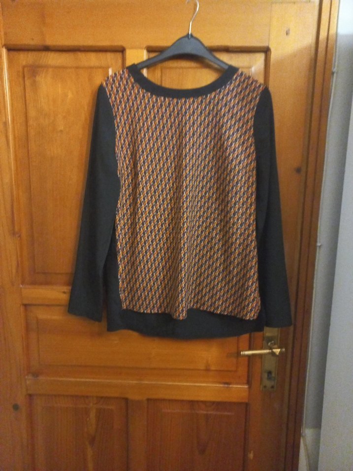 Kadın bluz, uzun kollu, yuvarlak yaka ve bol kesimdir. Örme kahverengi ön paneli sentetik kumaştan yapılmıştır, günlük rahat kullanıma uygundur.