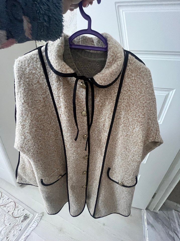 Yumuşak yün örme kumaştan yapılmış, rahat kesim midi kaban. Uzun kollu, gri renkte, siyah şerit detaylı ve cepli, günlük sokak stili için uygun.