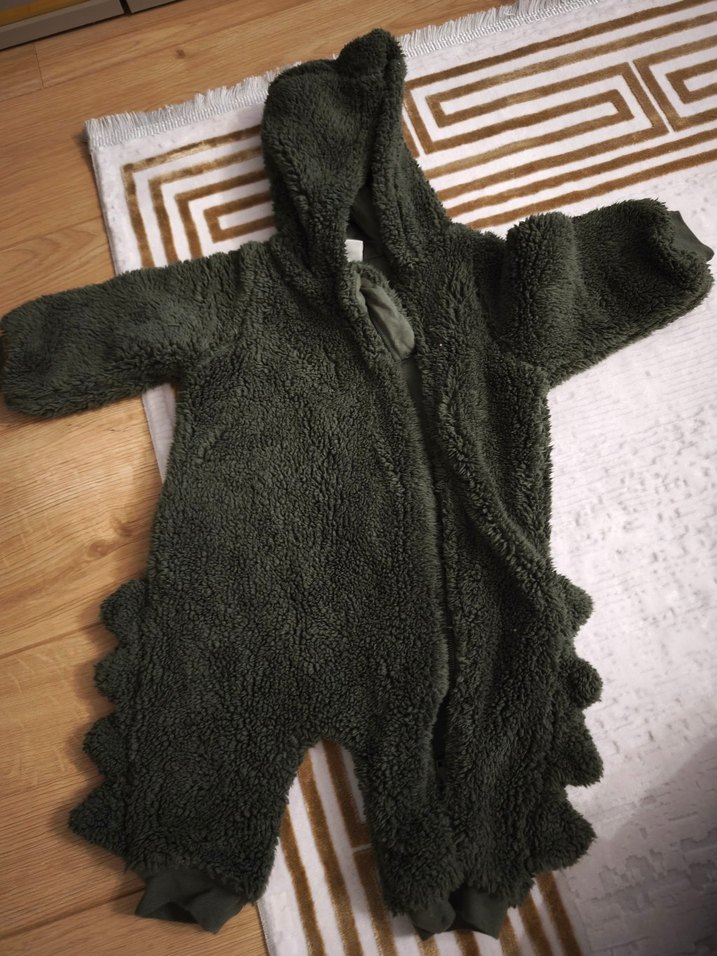 Yeşil örme kapüşonlu bebek tulumu, yumuşak ve sıcak kumaştan, kuyruk detaylı rahat tasarıma sahip.