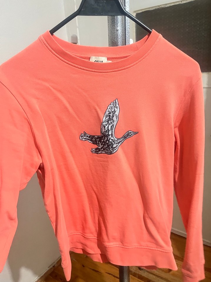Örme kumaştan yapılmış, kuş baskılı, yuvarlak yaka ve uzun kollu pembe rahat kesim sweatshirt. Günlük kullanım için uygundur. ️