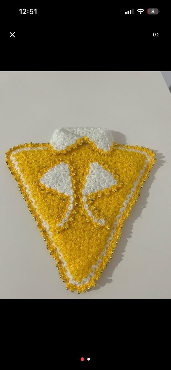 Sarı renkli, el yapımı üçgen şeklinde banyo süngeri, beyaz detaylar ve boncuklu kenarlarla nazik temizlik sağlar.