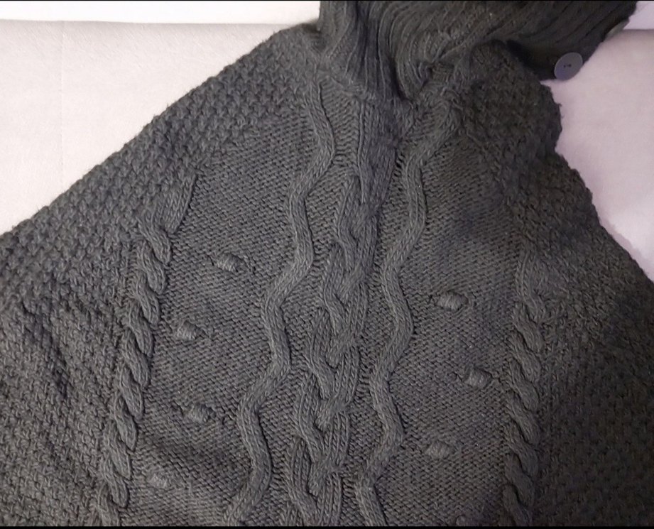 siyah , S beden ,13-16 yaş arasıkız çocukları için uyumlu ,hazır örme görünümlü panço. degaje yaka ,yakası düğme detaylı , önü örgü desenli , çok şık panço.