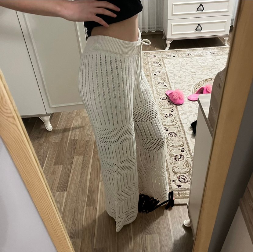 Bikini altı Beyaz örme pantolon, bol kesim ve midi boyda, bohem tarzıyla günlük kullanıma uygun. Yumuşak örme kumaşıyla rahat ve konforlu.