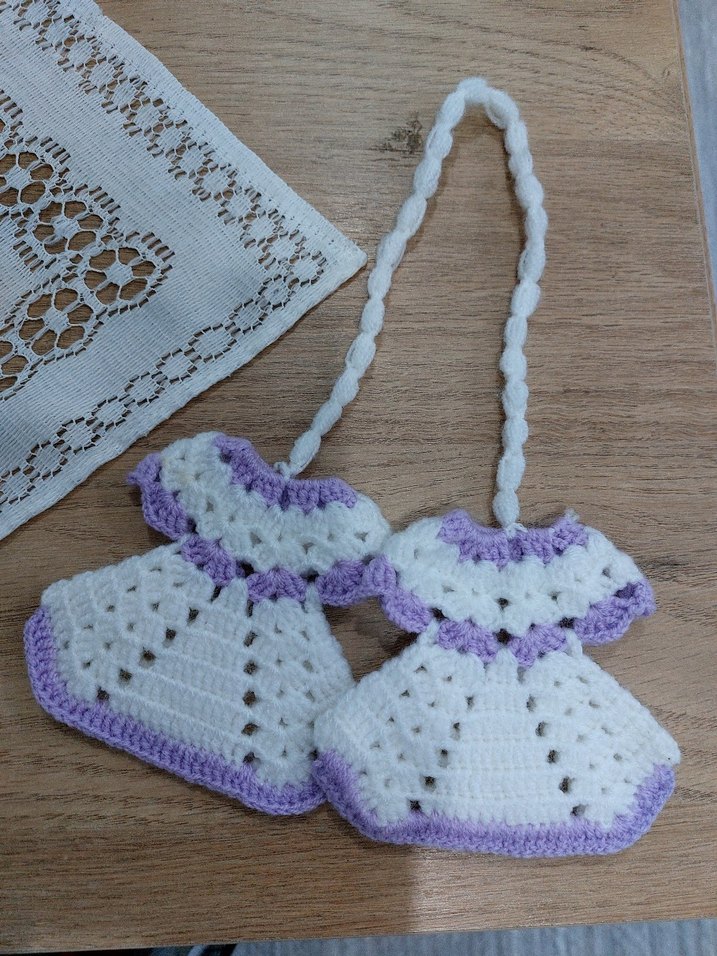 Yumuşak örme Tutacak mor pastel tonlarında kolay kullanım için örgülü askıya sahip.