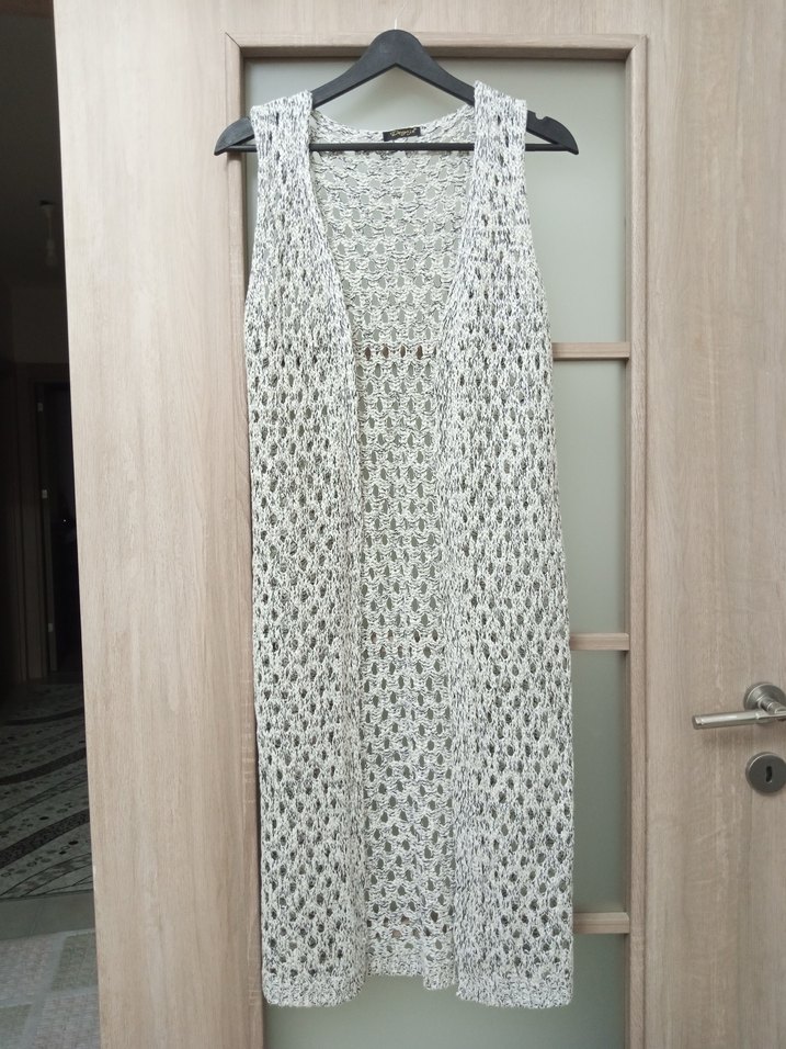 Ürün standart beden, siyah ve beyaz karışık renk, delikli örme kumaş, yazın etek ve şort üzerine almalık spor şık uzun yelek, ancak bir kez kullandım, bedenime küçük geldiği için satıyorum