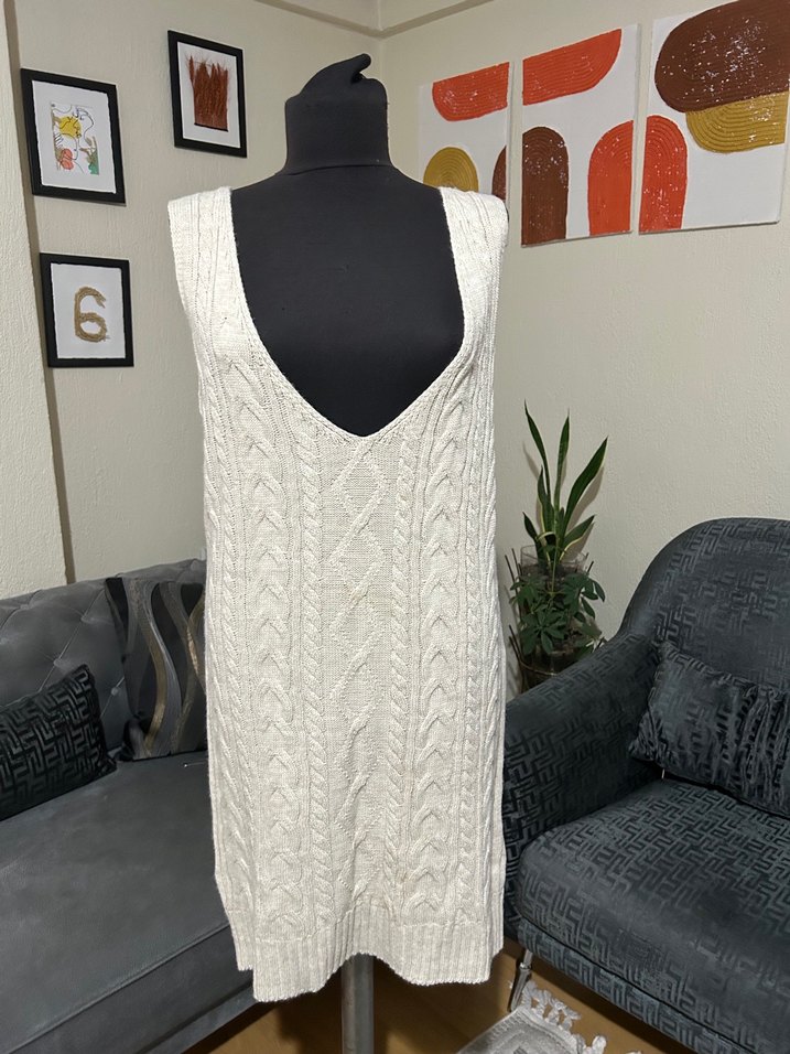 V yaka, kolsuz, bol kesim örme elbiseBeyaz renkte, desen içermeyen rahat ve bohem tarzda bir parça. İstediğim gibi durmadığı için satıyorum ürün kullanılmadı bana dar geldi bol durmasını istemiyordum