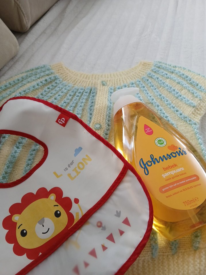 Johnson's bebek şampuanı 750 ml şişede ve aslan temalı bebek mama önlüğü birlikte, nazik bakım ve sevimli bir beslenme aksesuarı sunar. yelek az kullanıldı temizler şampuan acılmadı