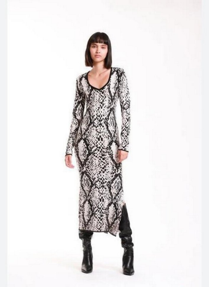 Yılan desenli, V yaka ve uzun kollu, örme sentetik kumaştan üretilmiş, vücuda oturan uzun elbise. Günlük kullanıma uygun, çağdaş ve avangart tarzda gri tonlarında.