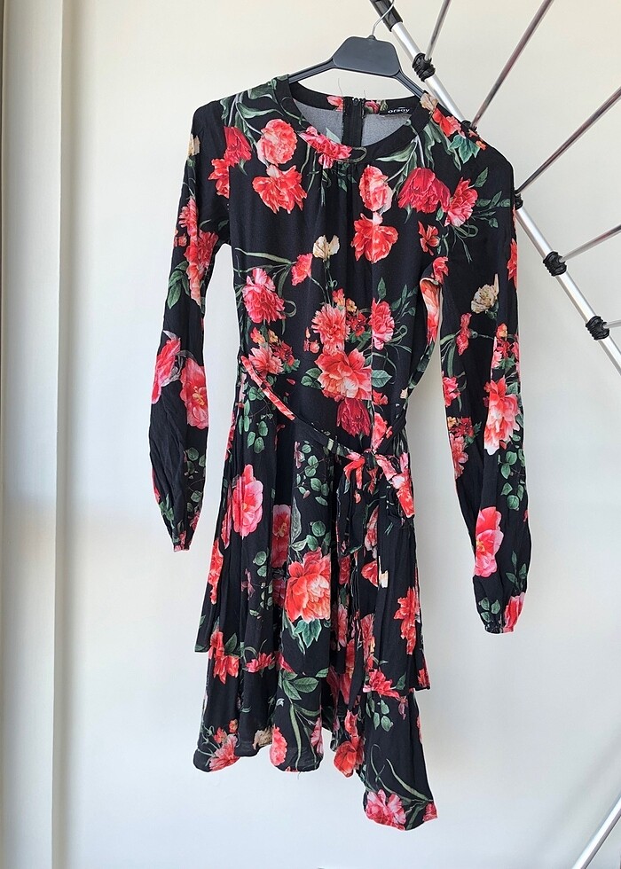 Orsay markalı pamuk tiril tiril ince kumaşından iri kırmızı çiçek deseni olan çift volan etekli, uzun kollu, bisiklet yaka elbise; kendi kumaşından kuşağı var; hem gündüz hem gece, hem günlük hem şık bir giyim olarak kullanılabilir