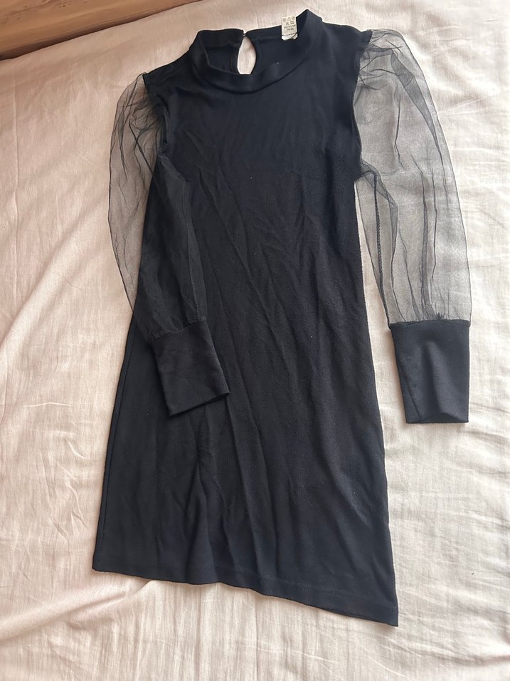 Yüksek yakalı, uzun ve drapeli tül kollu, siyah gotik tarzda dar kesim akşam elbisesi.