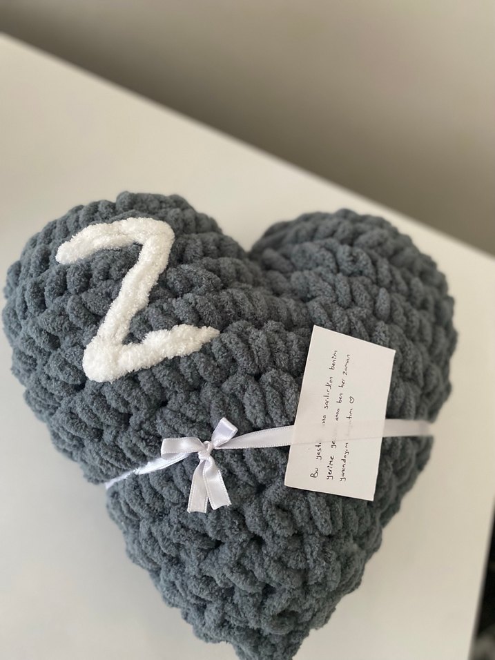 Orta boy beyaz harf detaylı gri renk kalpli yastık