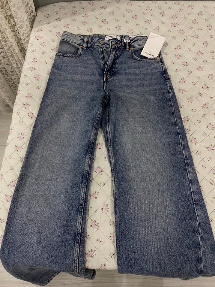 Orta mavi renk içeriği ve yıkamalı görünümü ile harika bir tarz ortaya koyar. Geniş ve uzun paçalara sahiptir.