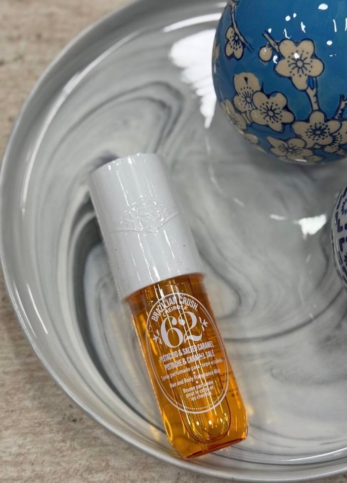 Beyaz kapaklı ve amber renkli şişede, 62+ puanlı kadın saç ve vücut spreyi Hafif ve ferah bir koku sunar.
