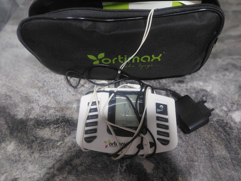 Ortinax kişisel bakım cihazı, gri ve beyaz renkte, dijital ekran ve çoklu fonksiyon düğmeleri ile birlikte gelir. Taşıma çantası ve kablolar dahildir. ⚙️