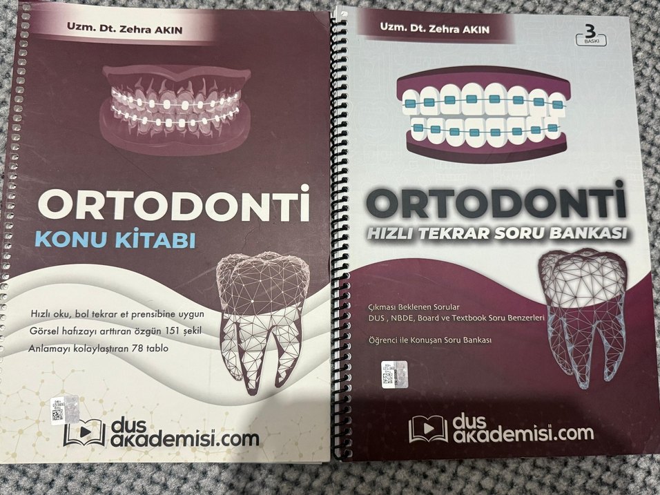 Ortodonti alanında sınav hazırlık kitabı, 151 şekil ve DUS, NBDE, Board sorularını içerir. Öğrenciyle konuşan soru bankası sunar. Konu kitabı görseldeki gibi kullanılmıştır Soru kitabı şıkları işaretlenmeden görseldeki gibi kullanılmıştır