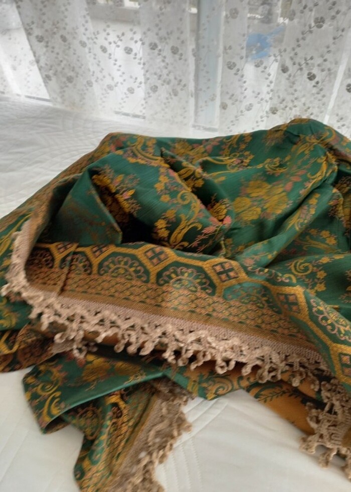 Yanar döner örtü masa üzerine veya kirlent olarak kullanılır.185 e 130 cm uzun kenarları sacakli saçakları başka örtüler kullanabilirsiniz .50 yıllık yurtdisindan alınmıştır