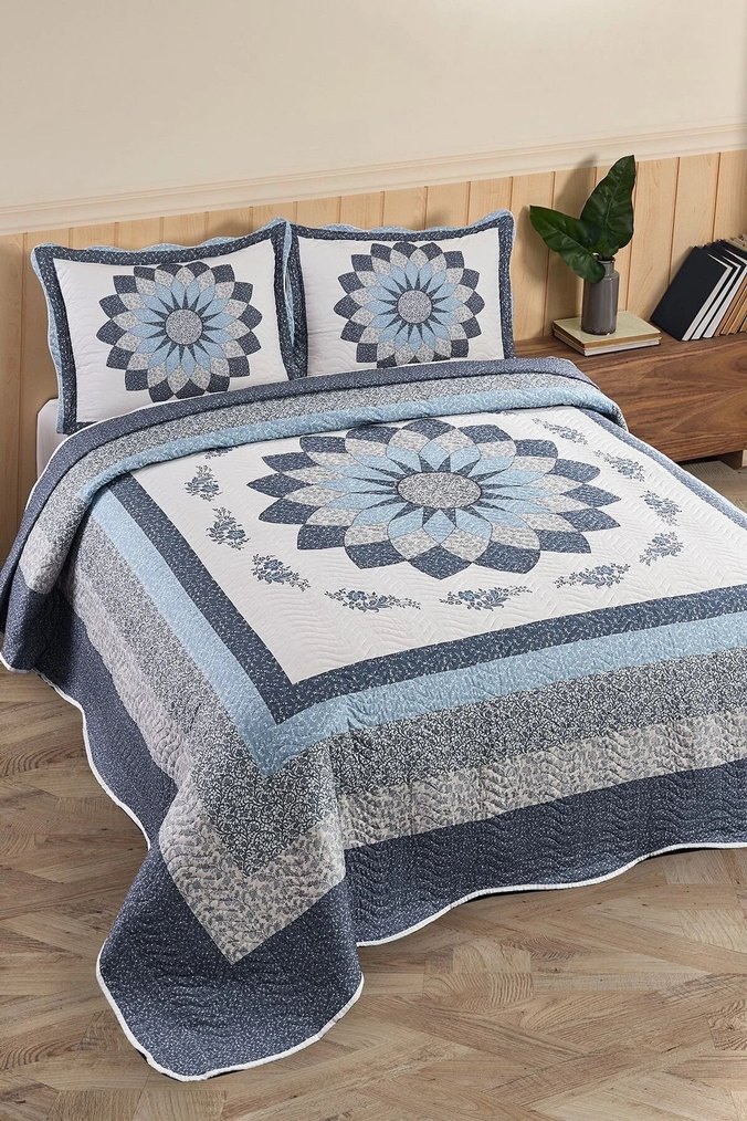 Mavi ve gri tonlarda nakışlı çiçek deseniyle yatak odanıza yumuşak ve şık bir dokunuş katar. ️ Zarafeti ve canlı renkleriyle kaliteyi uyku saatlerinize taşıyan Örtüm Yatak Örtüsü Takımları yatak odanıza yenilik katmasıyla beraber konforlu uykunun tadını çıkarmanıza olanak tanır. Dolgu malzemesi arada kalacak şekilde çift taraflı kapitone işlemi uygulanarak üretilen yatak örtüsü takımları yatağınızın ömrünü uzatırken sizlere keyifli uykunun tadını çıkartmak kalıyor. Günlük ve çeyizlik kullanıma uygundur. Set olarak satılmaktadır. Kutu Özelliği: Fermuarlı Şeffaf Paket Kutu İçeriği: Yatak Örtüsü:250x260 cm, (1 Adet) Yastık Kılıfı: 50x70 cm (2 Adet) Malzeme Bilgisi: 54 tel dokuma sıklığına sahip kumaştan üretilmektedir. %100 Polyester, Mikro Kumaş Bakım Bilgisi: 30 derece makinede yıkanabilir. Ütülenmez. Ağartıcı kullanılamaz. Kuru temizleme yapılmaz.