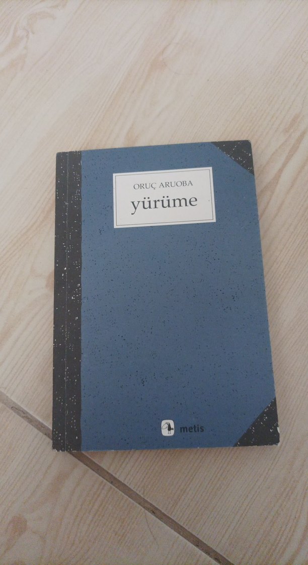 Metis yayınevinin Oruç Aruoba imzalı "Yürüme" adlı romanı. Mavi kapak, siyah köşeler ve sırtıyla sade tasarım.