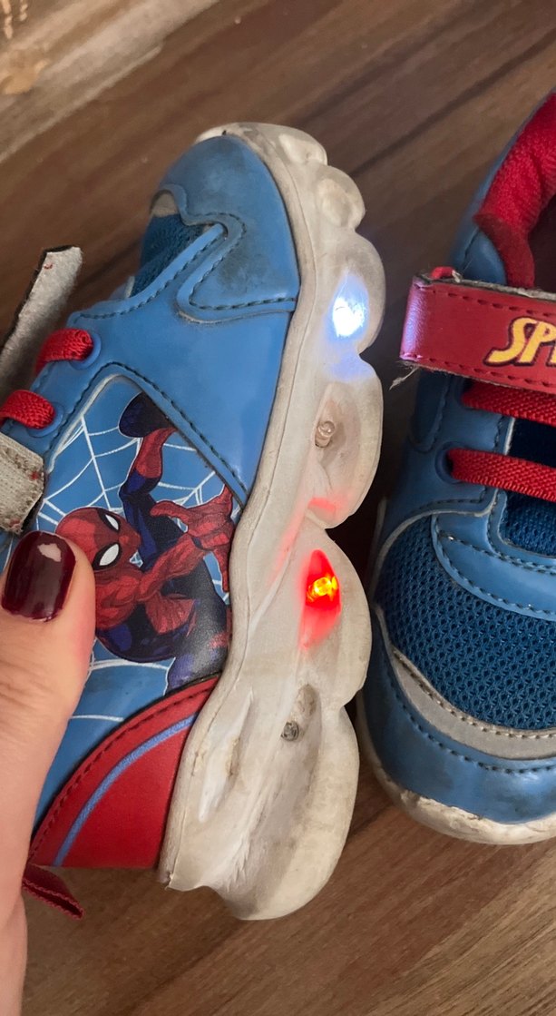 Mavi tonlarda, Örümcek Adam baskılı, ışıklı tabanlı erkek çocuk spor ayakkabısı. Kolay giyilen cırt cırtlı ve kauçuk tabanlıdır.