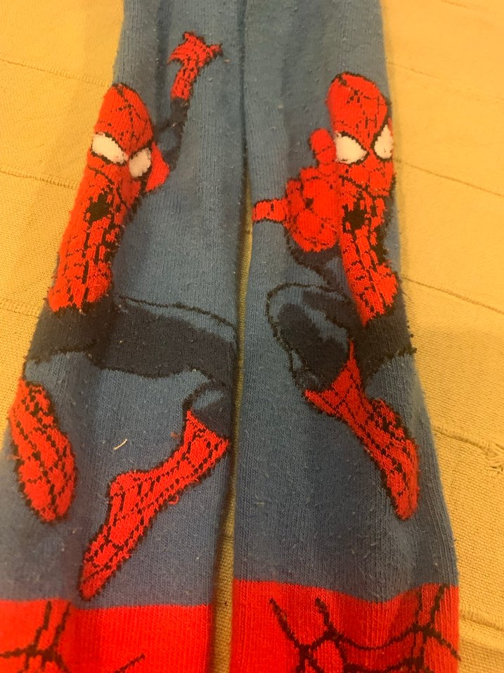 Koyu mavi zemin üzerine canlı kırmızı ve siyah Örümcek Adam baskılı erkek çoraplar. Renkli desenlerle eğlenceli bir görünüm sunar. 3/4yaş