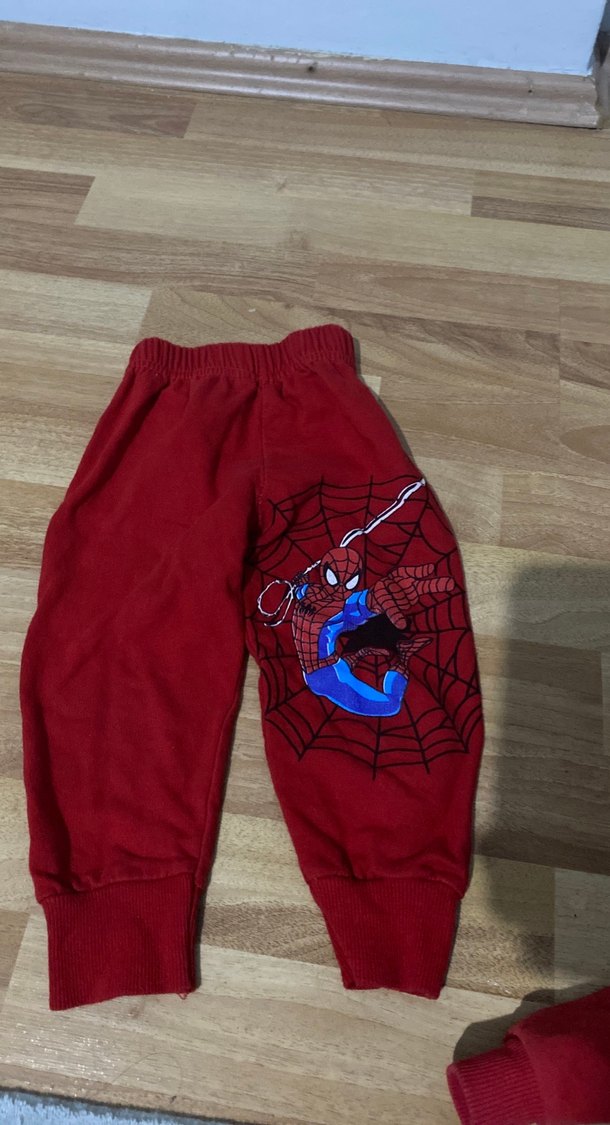 Yumuşak fleece kumaştan, örümcek adam baskılı, gevşek kesim kırmızı erkek çocuk eşofman altı. Örgü detaylı, rahat ve renkli sokak stili. ️