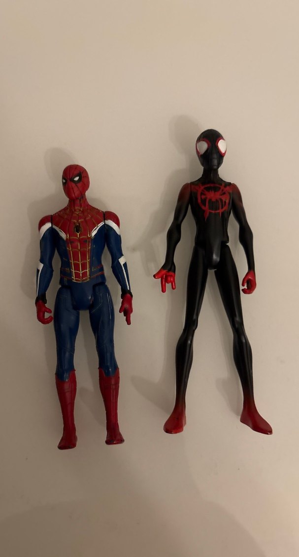 Kırmızı, siyah ve mavi renklerde detaylı tasarıma sahip iki karanlık temalı Örümcek Adam figürü. ️