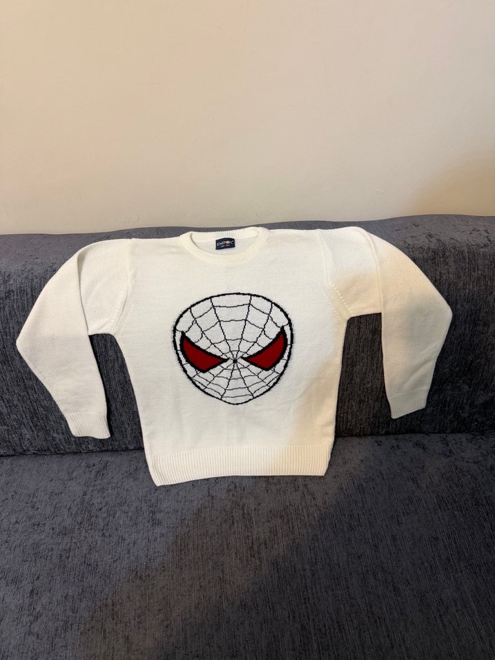 4-5 yaş. Beyaz renk. Örümcek adam resimli. Kusuru yok Fitted kesim, yuvarlak yaka ve uzun kollu örme erkek sweatshirt. Önünde nakışlı Spiderman yüzü deseni bulunur, rahat ve trend sokak stili sunar.