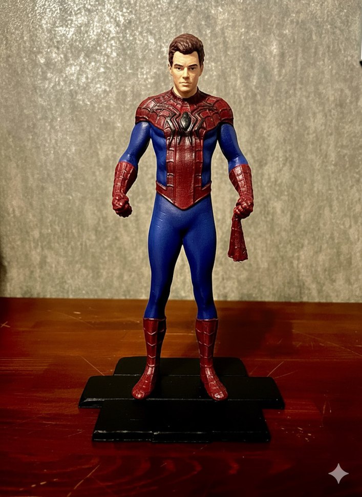 Kırmızı mavi kostümlü, detaylı örümcek adam figürü koyu kahverengi saçlıdır ve siyah taban üzerinde durmaktadır. ️