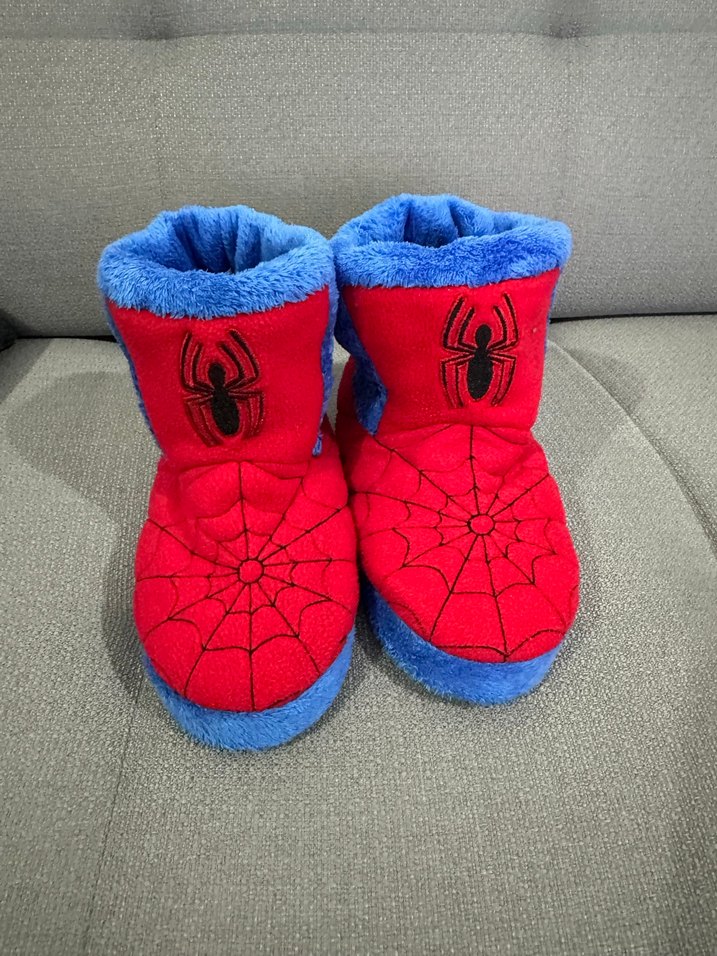 Renkli kırmızı ve mavi tonlarda örülmüş, nakışlı örümcek ve ağ desenli, yumuşak ve sıcak kumaştan erkek çocuk ev botu. 34-35 numara az kullanılmıştır.