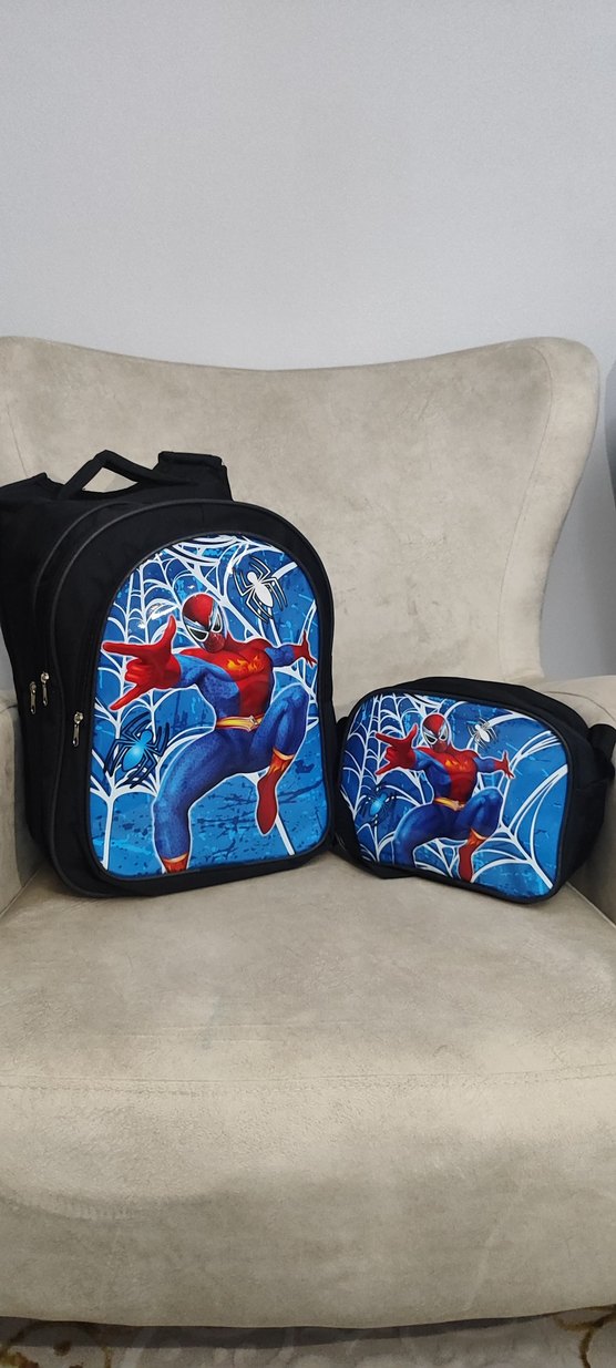 Renkli mavi Örümcek Adam desenli okul çantası seti, sırt çantası ve küçük çantadan oluşur. ️Ürün tamamen sıfır olup hata deforme yoktur. Üç bölmeli ve suluk haznesi mevcuttur.