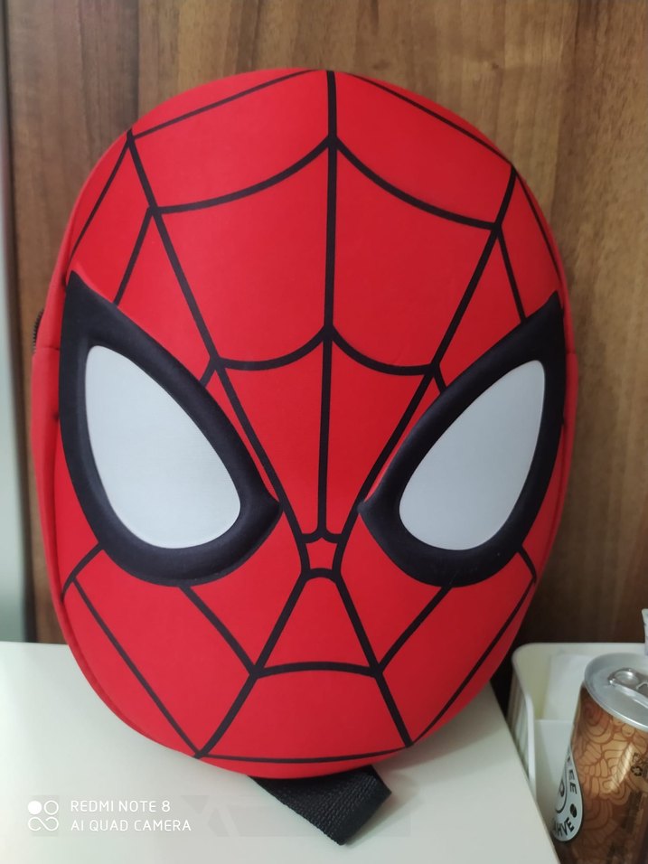 Kırmızı renkte, Örümcek Adam yüz tasarımlı çocuk okul çantası, siyah ağ desenleri ve büyük beyaz gözlerle.