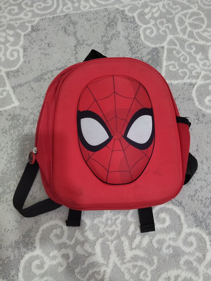 Ayarlanabilir askılı, yan file cepli kırmızı çocuk sırt çantası, Örümcek Adam yüzü baskılı. ️