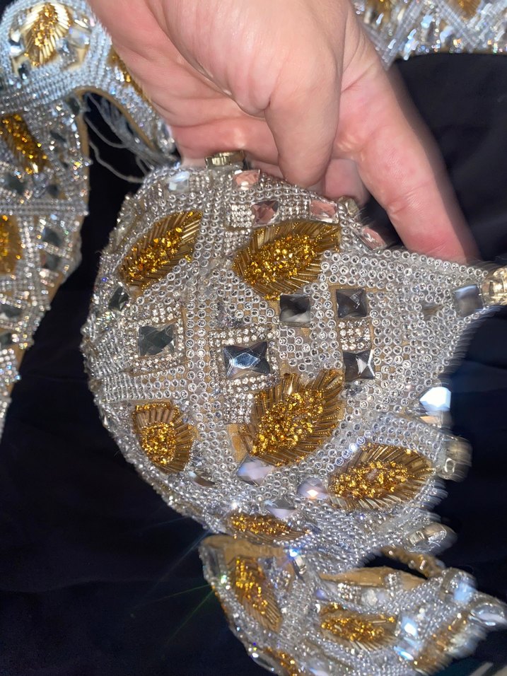 Özel dikim oryantal kostümüdür İki siyah kolluk bir adet siyah etek İki beyaz koltuk bir adet beyaz etek Ayakkabı 38,5/39 /40 Oryantal büstiyeri üstü Oryantal kemeri uyumludur Altın işlemeli, parlak payetler ve kristal detaylara sahip kadın el zinciri. Parti için avant-garde tarzda bir aksesuar. ✨