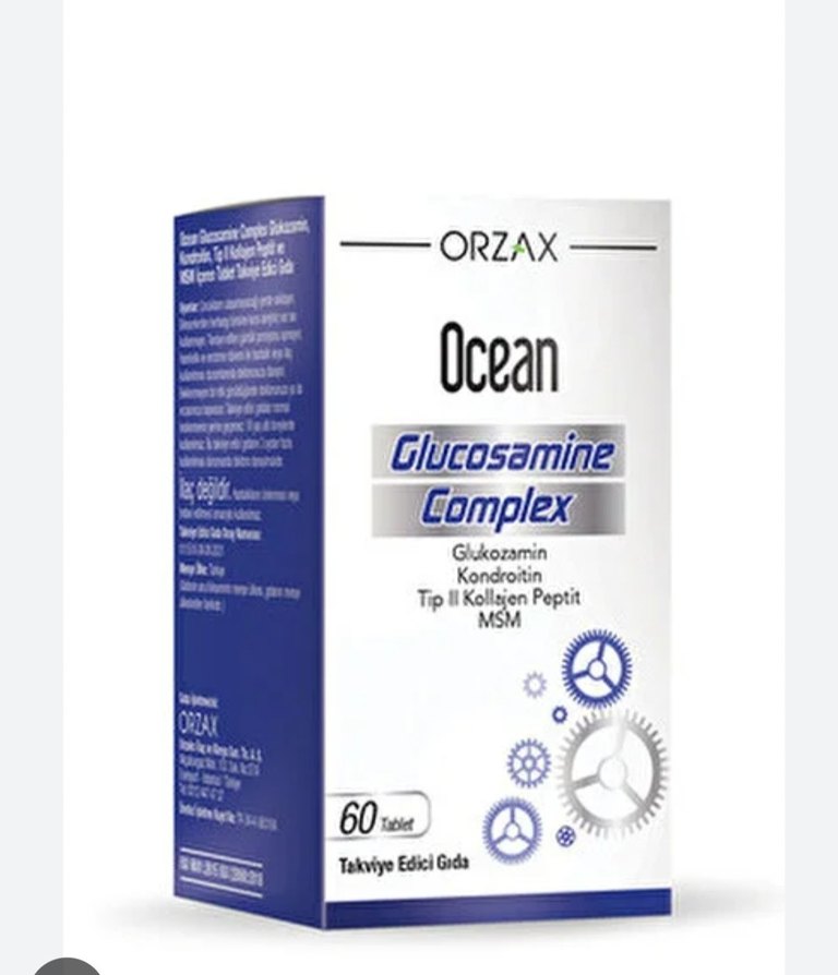 Orzax Ocean Glukozamin Kompleksi, glukozamin, kondroitin, tip II kollajen peptit ve MSM içerir. eklem ağrıları ve sıvı kaybi için bire birdir. ihtiyaç fazlası.60 tabletlik takviye edici gıda paketidir. sıfırdir hiç açılmadı. sadece dış kutusu yok. eczaneden alındı sorunsuzdur.