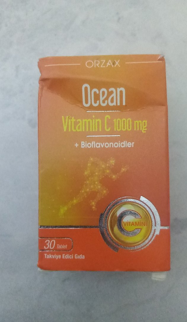 ORZAX Ocean Vitamin C 1000 mg toz takviye edici gıda, bioflavonoidler içerir ve parlak turuncu ambalajda, 30 tablet olarak sunulur.