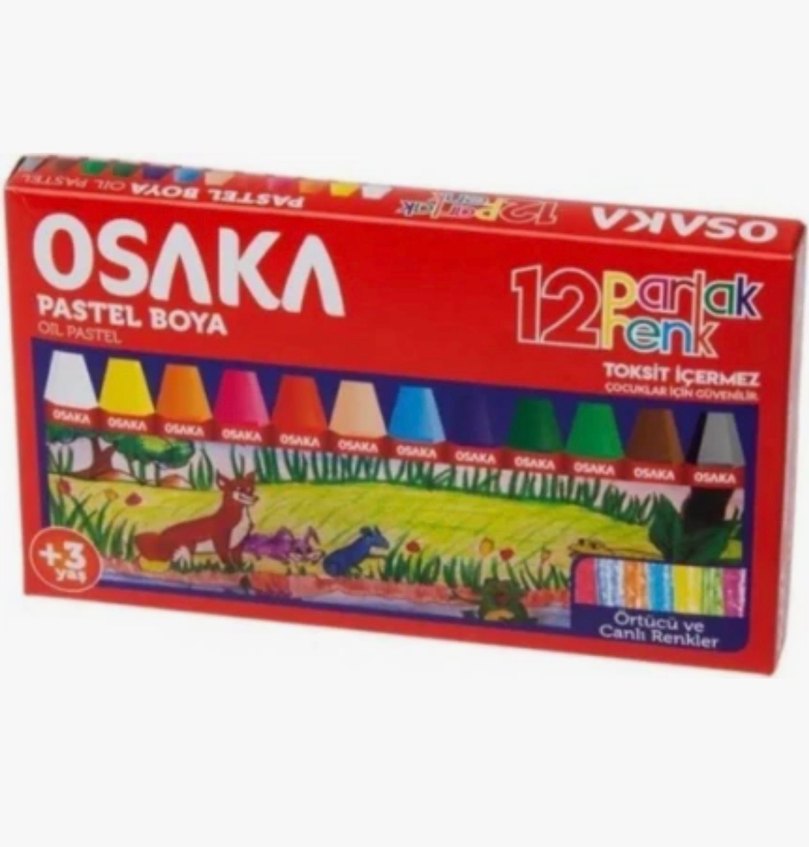Osaka markalı 12 renkli pastel boya seti, canlı ve çeşitli renk tonlarıyla çizim ve renklendirme için uygundur.