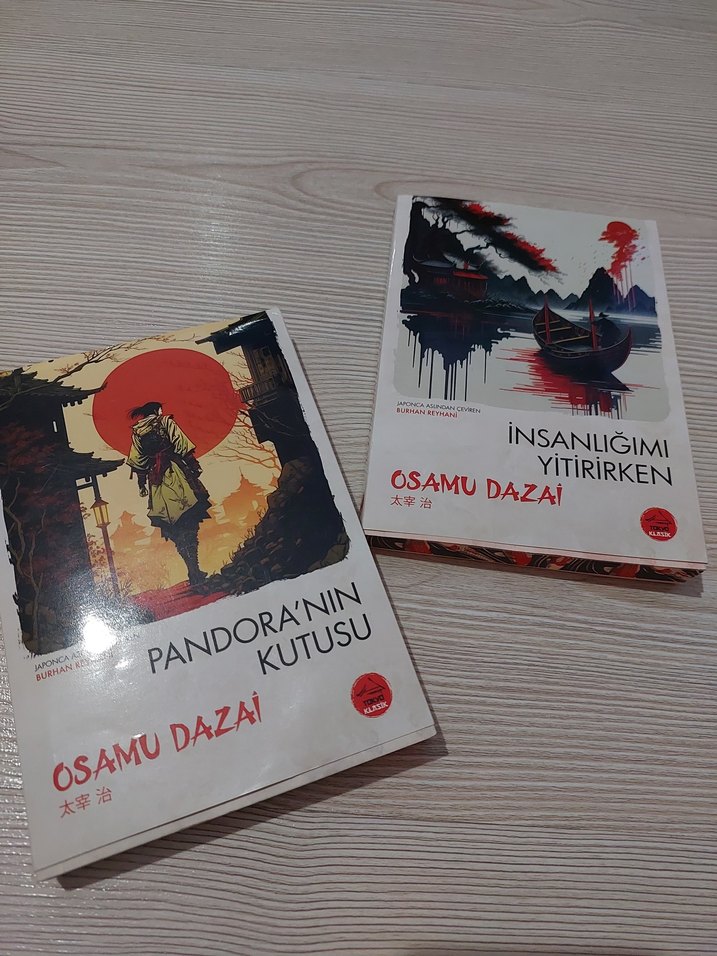 Osamu Dazai'nin "Pandora'nın Kutusu" ve "İnsanlığımı Yitirirken" adlı iki romanını içeren set. Her iki kitap da dikkat çekici kapaklara sahip.