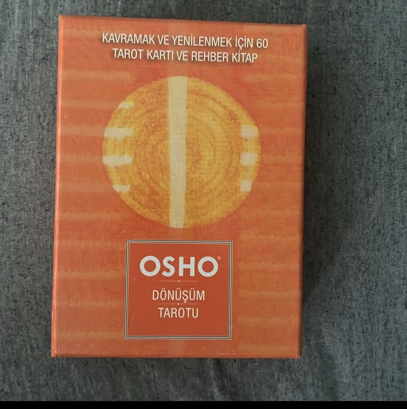 Osho Dönüşüm Tarotu 60 kart ve kavramak, yenilenmek için rehber kitap içerir. Biraz kullandım artık satmak istiyorum. Çok güzel bi tarot kesinlikle çok isabetli ve sanki daha dini açıdan bakıyor gibi hissettirdi bana son yüklediğim kartlar biraz deforme olmuş ama sadece o kartları getirteceğiniz siteler var