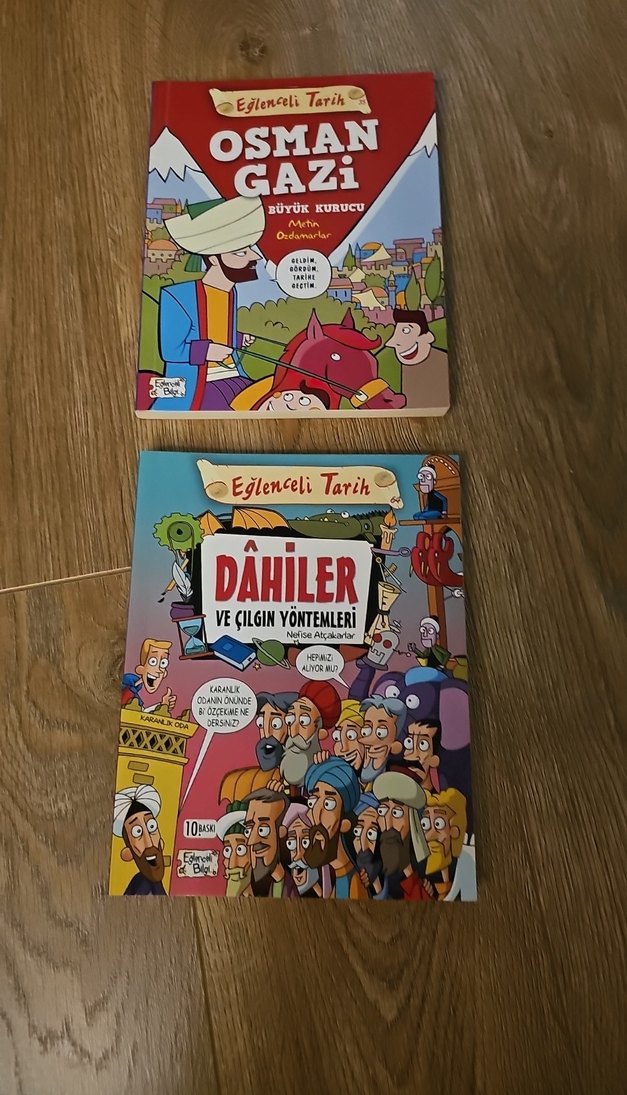 "Osman Gazi" ve "Dâhiler ve Çılgın Yöntemleri" adlı, eğlenceli tarih temalı çocuk kitapları. Renkli çizimler ve öğretici içerik içerir.