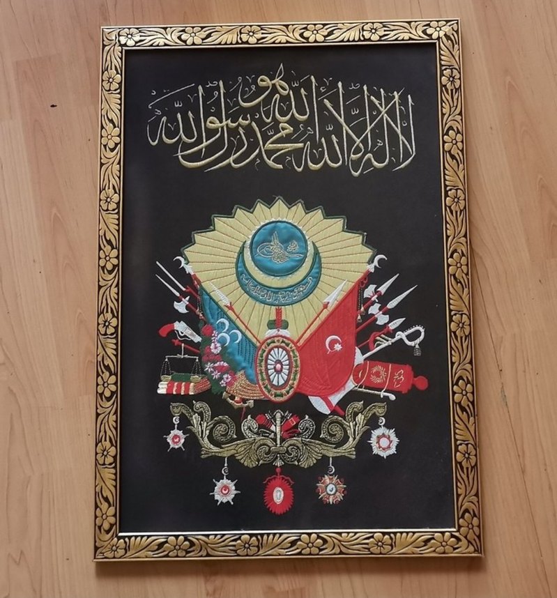Altın tonlarda Osmanlı arması ve Kelime-i Tevhid yazısı, koyu zemin üzerinde yer alır. Çerçevesi altın çiçek desenlidir.