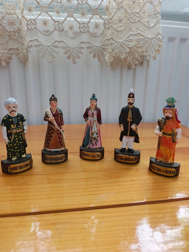 Koyu tonlarda, çok renkli Osmanlı sultanlarını temsil eden 5 figür. Her biri geleneksel kıyafetlerle detaylandırılmış ve tabanlarında isimleri yazılıdır. hepsi mıknatıslı